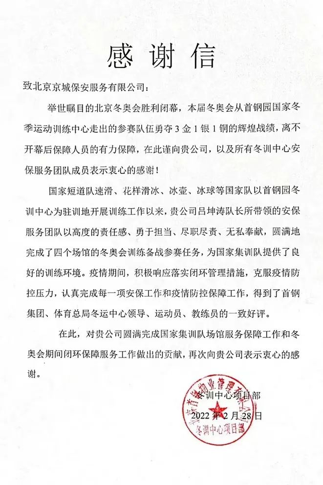 首鋼園冬訓(xùn)中心場館的安保服務(wù)團(tuán)隊在各項安保工作和疫情防控保障工作中,得到了首鋼集團(tuán)、體育總局冬運(yùn)中心領(lǐng)導(dǎo)、運(yùn)動員、教練員的一致好評,收到了一封誠摯的感謝信。