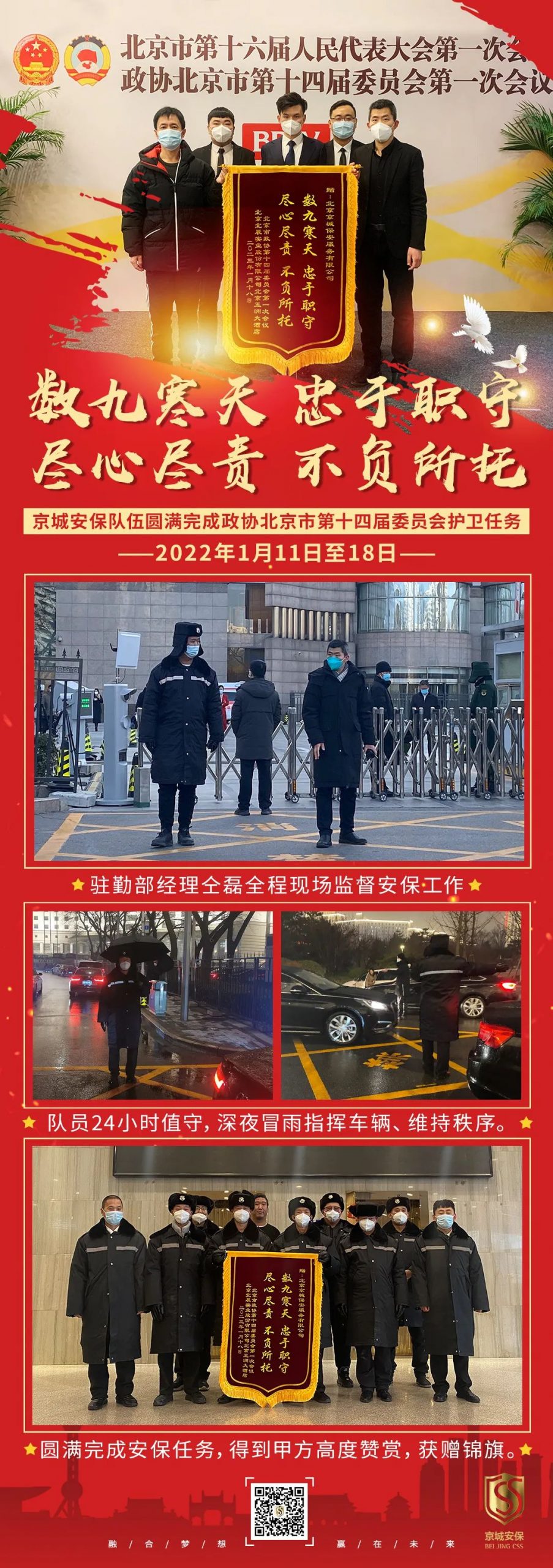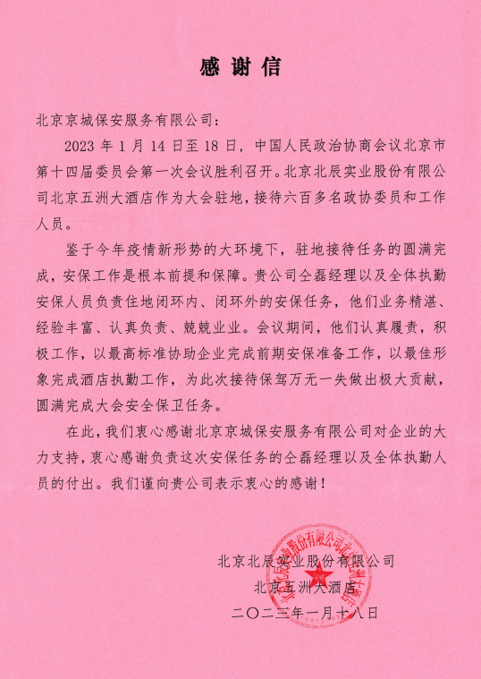 盡心盡責(zé) 不負(fù)所托 | 京城安保隊(duì)伍圓滿完成政協(xié)北京市第十四屆委員會(huì)護(hù)衛(wèi)任務(wù) 榮獲表揚(yáng)信 閱讀人數(shù): 307 相關(guān)內(nèi)容 京城頭條丨消防比武獲佳績(jī) 實(shí)戰(zhàn)演練保安全 為全面貫徹2025年全國(guó)消防宣… 京城頭條丨北京京城保安服務(wù)有限公司連續(xù)九年獲評(píng)保安服務(wù)公司(人力防范)一級(jí)資質(zhì) 9月28日,北京京城保安服務(wù)有… 京城頭條丨節(jié)日?qǐng)?jiān)守顯擔(dān)當(dāng) 溫情守護(hù)獲肯定 國(guó)慶、中秋雙節(jié)期間,京城安保隊(duì)…