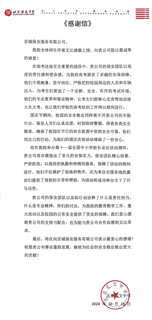 近日,匯文中學(xué)發(fā)來感謝信,對我司安保隊伍在2024年度高考護(hù)航,第十一屆全國中小學(xué)校長論壇及國慶假期安保工作中的辛勤付出表示誠摯感謝。京城安保隊伍自2019年入駐匯文中學(xué)項目以來,始終秉承“安全第一、預(yù)防為主”的工作理念,與學(xué)校攜手共建平安校園。為教育教學(xué)工作、重大活動以及校園日常安全提供了堅實保障,贏得了校領(lǐng)導(dǎo)、師生及家長的高度肯定和一致好評。