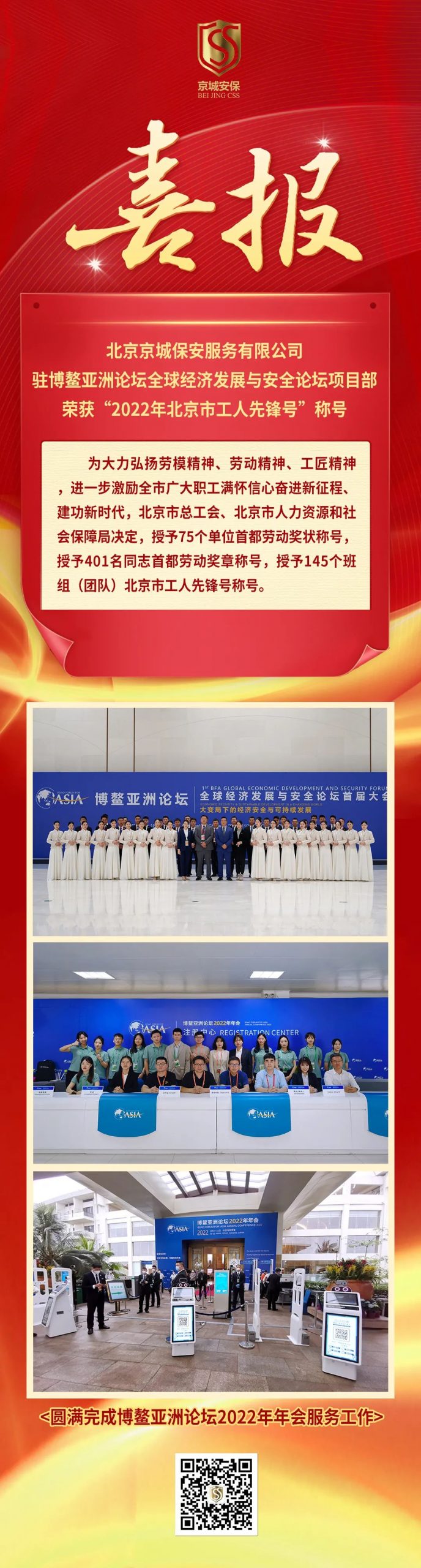 喜報|京城駐博鰲亞洲論壇全球經(jīng)濟發(fā)展與安全論壇項目部榮獲“2022年北京市工人先鋒號”稱號 閱讀人數(shù): 323 相關(guān)內(nèi)容 京城頭條丨消防比武獲佳績 實戰(zhàn)演練保安全 為全面貫徹2025年全國消防宣… 京城頭條丨北京京城保安服務(wù)有限公司連續(xù)九年獲評保安服務(wù)公司(人力防范)一級資質(zhì) 9月28日,北京京城保安服務(wù)有… 京城頭條丨節(jié)日堅守顯擔當 溫情守護獲肯定 國慶、中秋雙節(jié)期間,京城安保隊…