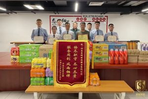 在全體隊(duì)員的執(zhí)著堅(jiān)守和不懈努力下,大廈辦公安全得到了保障,真正做到了人員零接觸、零感染。盡職盡責(zé)、主動(dòng)作為,京城安保隊(duì)伍贏得了中信大廈項(xiàng)目部領(lǐng)導(dǎo)的一致肯定和表?yè)P(yáng)。7月6日,中信集團(tuán)授予京城安保隊(duì)伍錦旗一面、表?yè)P(yáng)信一封,并為隊(duì)員們發(fā)放了慰問(wèn)品,京城安保集團(tuán)副總經(jīng)理王海濤參加了錦旗授予儀式。為了表彰工作優(yōu)異、貢獻(xiàn)突出的安保、安檢隊(duì)員,駐中信大廈項(xiàng)目在隊(duì)伍中評(píng)選出“防疫突出貢獻(xiàn)獎(jiǎng)”一名、“防疫先鋒”三名、“防疫標(biāo)兵”十二名,頒發(fā)了證書和獎(jiǎng)金。