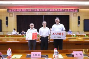 為大力弘揚勞模精神、勞動精神、工匠精神,選樹先進典型,樹立保安榜樣,大會對2022年獲得北京市工人先鋒號和2021年北京市職工職業(yè)技能大賽決賽獲獎單位和個人進行了表彰。京城安保集團駐博鰲亞洲論壇全球經(jīng)濟發(fā)展與安全論壇項目部榮獲“2022年北京市工人先鋒號”稱號,北京市政法衛(wèi)生文化工會主席張樹坡親自頒發(fā)最高獎項,京城安保集團副總經(jīng)理王勇,黨支部書記、工會主席王凱敏上臺領(lǐng)取“工人先鋒號”獎牌及榮譽證書,京城安保集團是北京保安服務(wù)行業(yè)唯一一家獲此殊榮的單位。