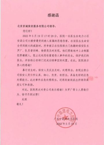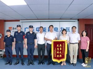 廣東中能建電力醫(yī)院領(lǐng)導(dǎo)為安保隊(duì)員頒發(fā)錦旗和感謝信