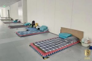 在大廈的54層,幾張泡沫墊鋪上薄薄的墊子拼湊成床,一個(gè)枕頭、一床被子加上簡(jiǎn)單的生活用品,隊(duì)員們就這樣住進(jìn)了臨時(shí)搭建的生活場(chǎng)地。